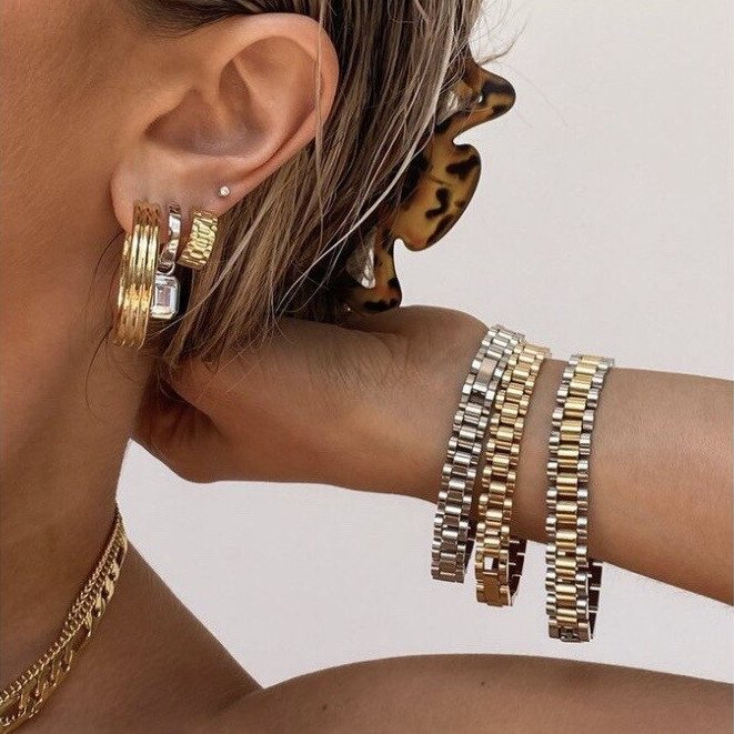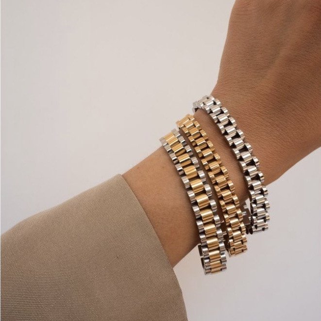 A chunky bracelet that was meant for layering. The Watch Band Bracelet has a luxurious feel and weight that looks great peeking out from your blazer sleeve. Evoke your inner boss babe vibes!